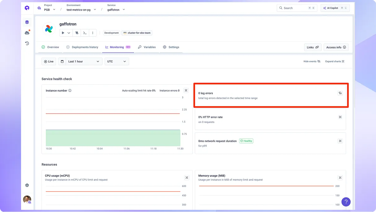 - Smart integration with monitoring: easily correlate application metrics and logs. For example, clicking the “error logs” card in your Monitoring tab now takes you directly to the Logs page, with filters automatically applied (time range and error level)