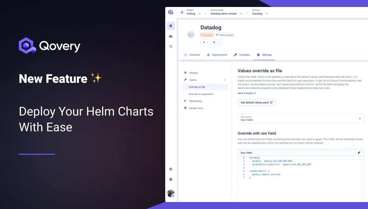 Consider the deployment of essential tools like the Datadog Helm Chart. Previously, this required Qovery Lifecycle Jobs, demanding significant manual configuration. Or manually connecting to the cluster and using the helm command 🥱.