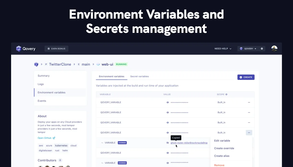 Environment Variables and Secrets are similar. The main difference is that the Secrets are encrypted, and a user can’t reveal the value. Both are injected at the build and runtime of your applications.