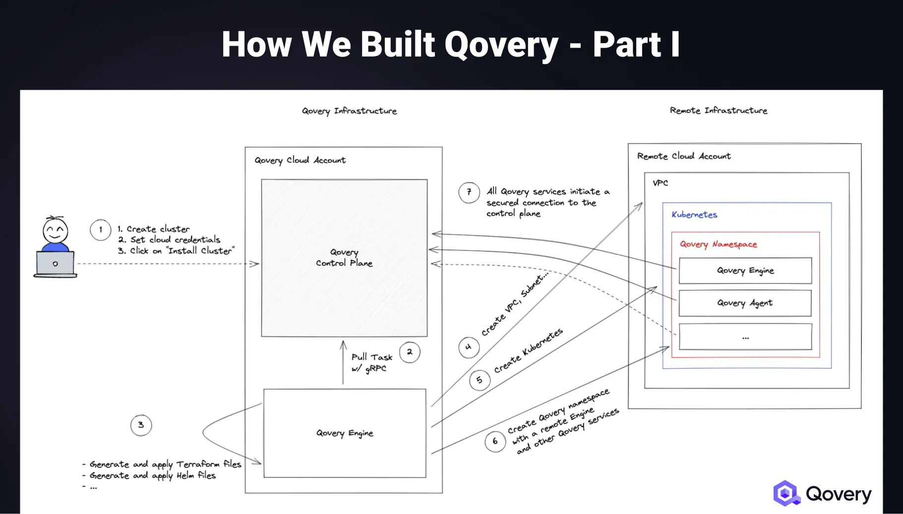 Here is an example of what happens when a user installs Qovery on his cloud account. The interesting part is that a local Qovery Engine (2) pulls a task from the control plane, generates all the configuration files (Terraform, Helm, and others), and bootstraps the full infrastructure on the target remote cloud account. The process is fully automatic and takes between 10 to 30 minutes, depending on the cloud provider target. Once the infrastructure is ready, a remote Qovery Engine is created and initiates a secured connection to the control plane.
