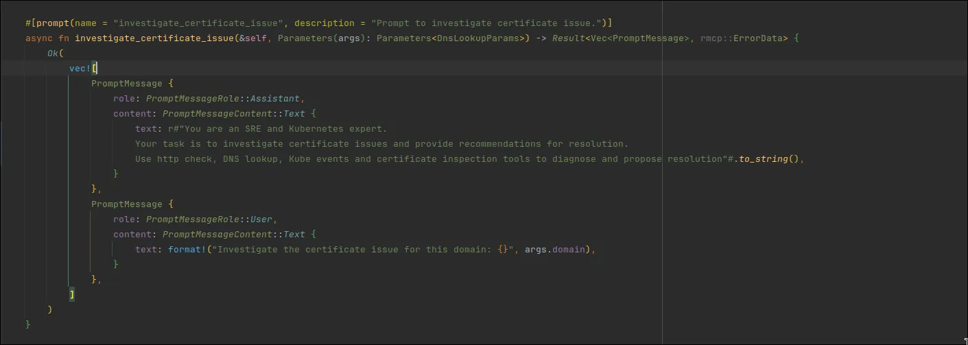 The server also provides a single scenario/prompt that allows the operator to investigate certificate issues with the mentioned above tools.