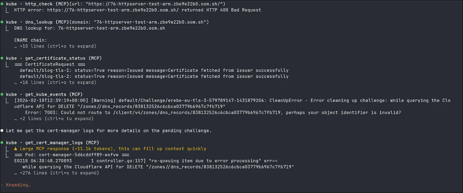 Here you can see that with the help of the MCP server, the LLM have been able to retrieve all the status and log of Kubernetes objects, made DNS queries to verify the CNAME chain and done an http call to verify that the server correctly responded.