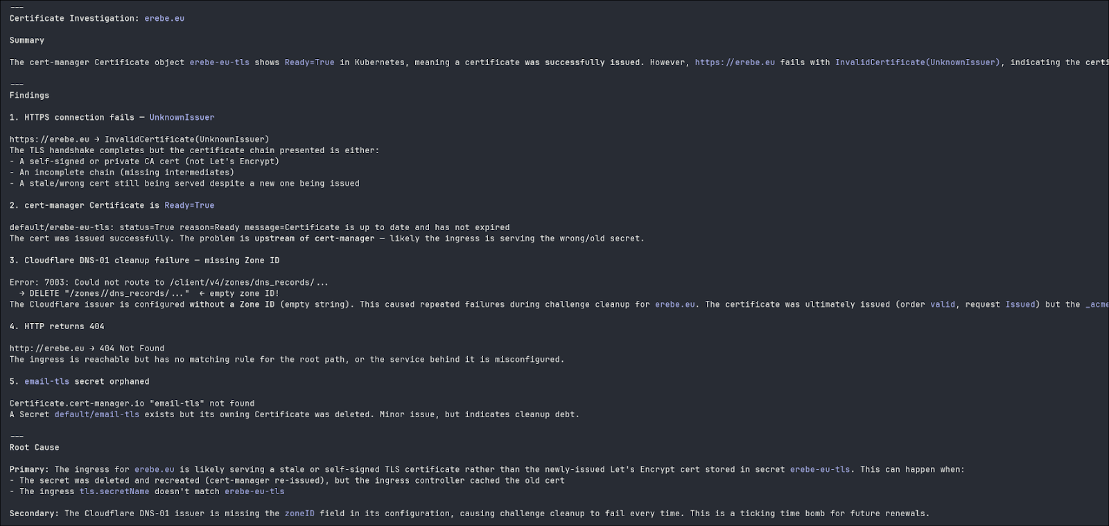 Another example where the secret containing the certificate is invalid. With the help of the HTTP call, the LLM is able to tell the certificate is invalid even while all cert-manager objects are green.