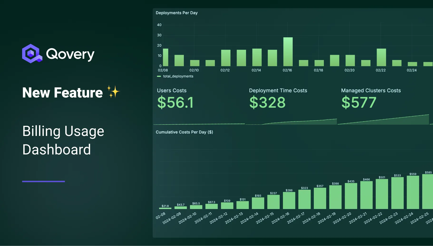 - Users: At the rate of $0.96 per user per day ($29 per user/month), this element helps you track the cost associated with each team member's access to Qovery.