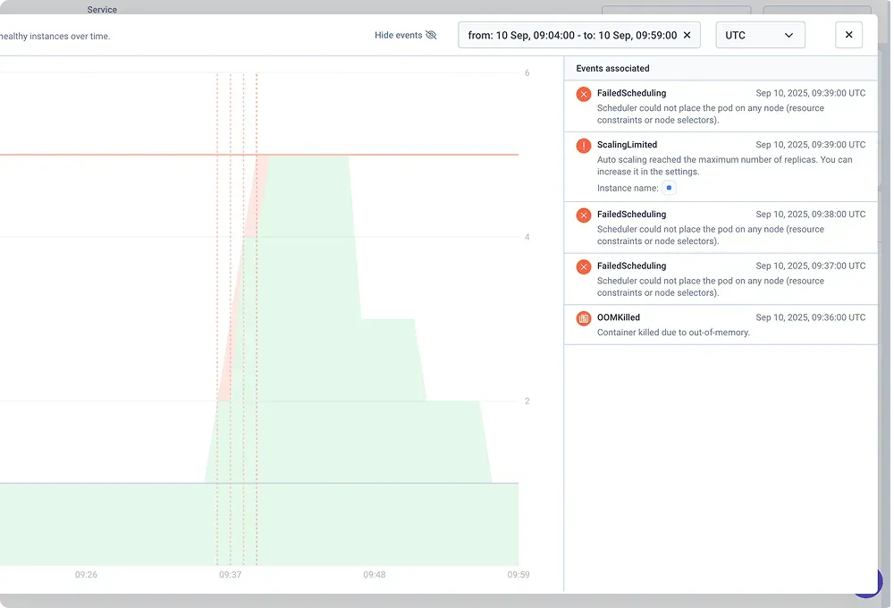 This unified timeline reveals connections between infrastructure changes and application problems. When issues coincide with deployments or autoscaling events, the relationship is immediately visible without cross-referencing separate systems.