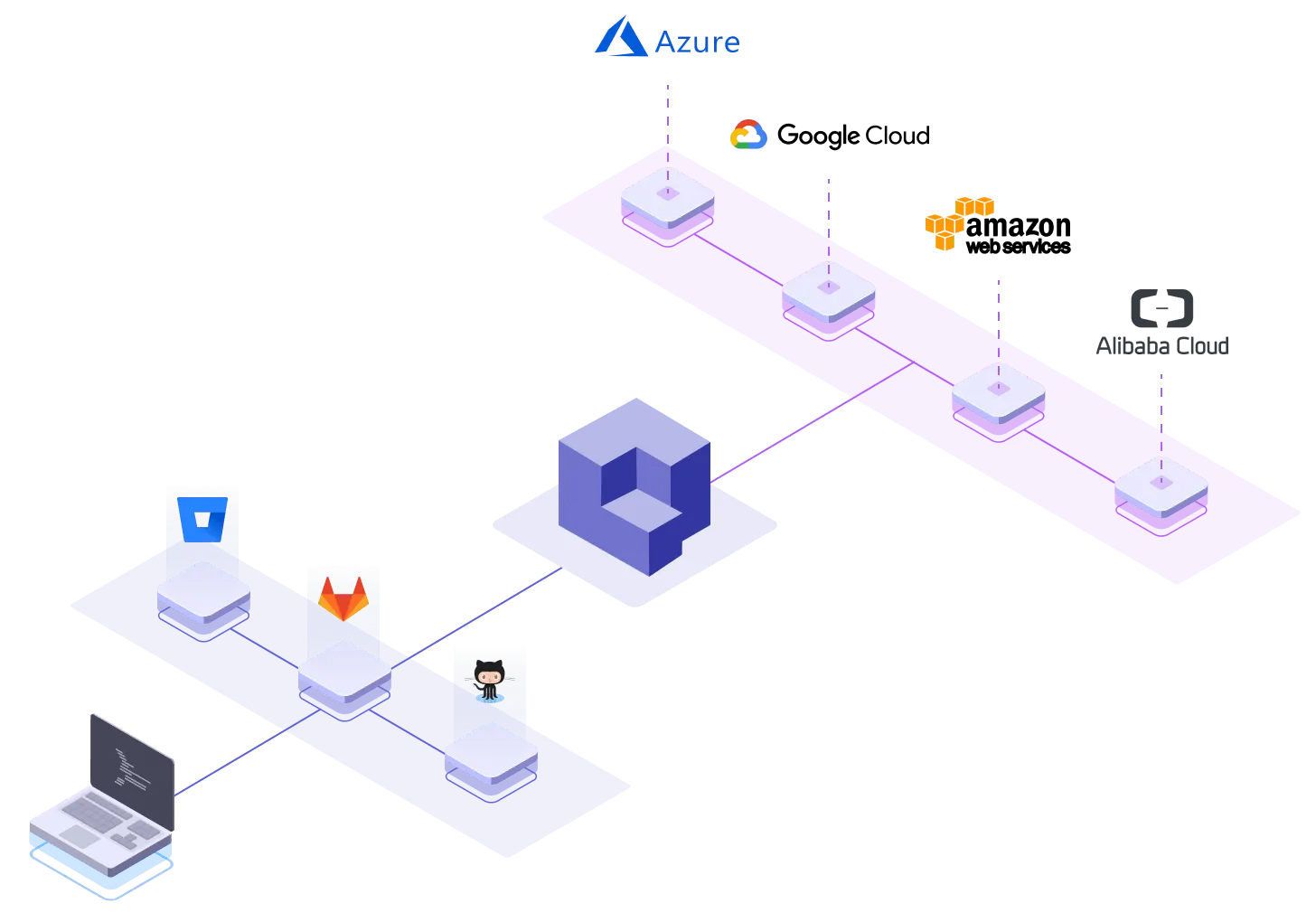 An all-in-one platform integrates the portal, deployment engine, environment management, and cloud connection into a single cohesive product. The components are designed to work together from the start rather than integrated after the fact.