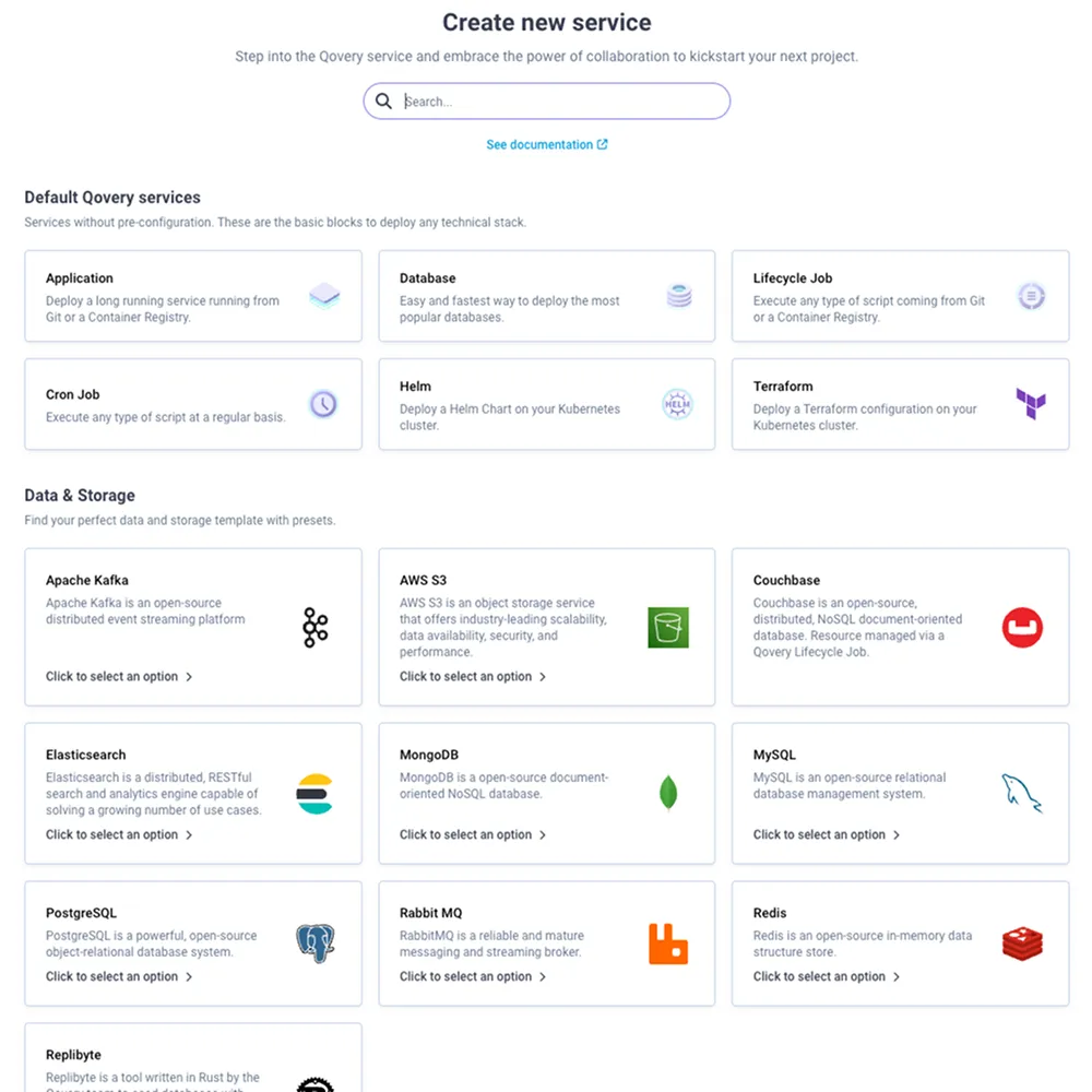 Run Terraform, CloudFormation, or any IaC tool directly in Qovery. Provision databases, queues, or any cloud resource, and expose them seamlessly to your services through environment variables. Not familiar with Terraform? Qovery provides you with templates to easily deploy any resource.